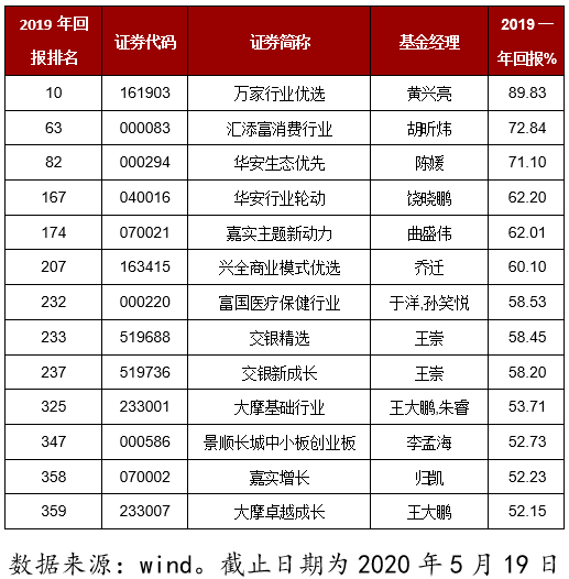 在国内的金融市场中,我们能避免幸存者偏差理论大胆相信基金经理吗?老罗为大家做了一些数据的分析,将现在市场中有的主动基金(具体标准为wind开放式基金分类中普通股票型基金、偏股混合型基金和平衡混合型基金,截止时间为2020年5月19日)筛选出来,总共有1703只,针对这些基金我们进行统计分析。经过对2015年至2018年四年的一年回报率进行排序统计,发现连续四年回报率在前三分之一的产品只有36只,大概是总数的五十分之一。根据随机性1703只基金产品中以1/3的概率计算稳定表现四年的幸运儿将有21只,真实情况并不比随机筛选有太多优势,对于投资者来说也一样是难以选出的概率。在这36只基金中在2019年一年回报率(有完整2019年度收益率数据的基金共1104只)在所有基金前排名前三分之一的只有13只,如下表所示。在前四年的36之中随机选出三分之一可以得到12只基金,与第五年业绩达到前三分之一的基金数基本相同,其实侧面证明了我们有时看到的“金牌基金”是随机产生的幸存者。可见即使有个别实力派,但基本还是可以说国内的基金市场中同样也存在着幸存者现象。
