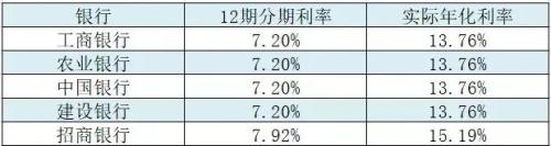 如图所示,很多银行的“12期分期利率”在7.20%。看似方便实惠,实际利率却差不多是7.20%的两倍,为13.76%。