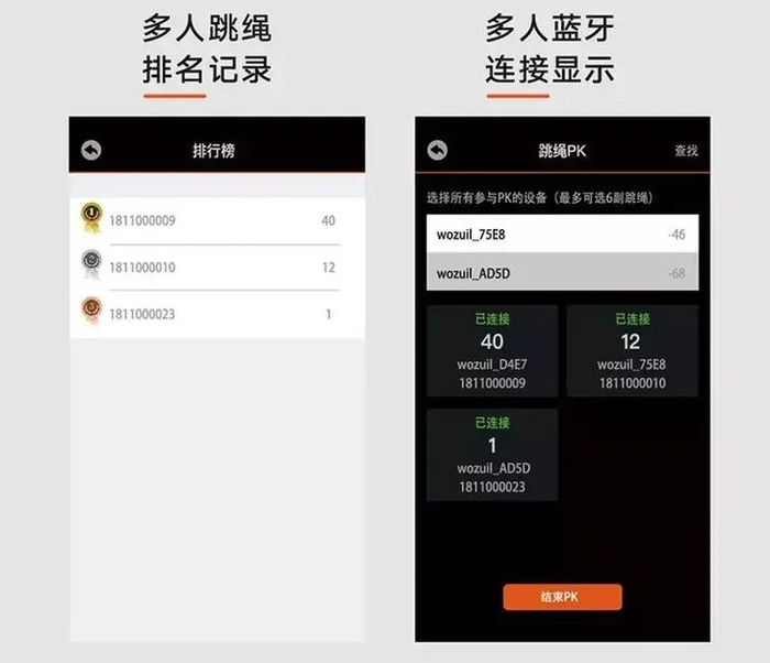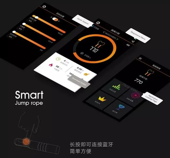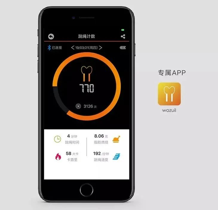 运用了低功耗蓝牙芯片技术,可以实时把跳绳数据传输出来,显示在手机APP界面上,更加精准、方便。