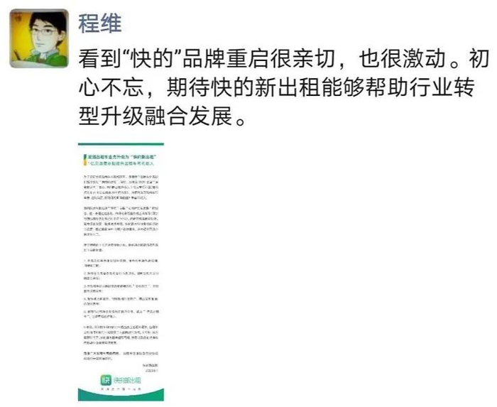 9月1日,程维发了一条朋友圈表示,看到“快的”品牌重启很亲切,也很激动。