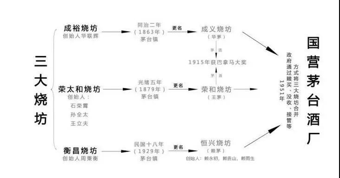 这三家烧酒坊分别是:成义、荣和、恒兴,三家所酿的茅台酒分别被世人称为“华茅”、“王茅”、“赖茅”(以烧酒坊创始人的姓氏命名)。