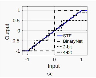 另外,由于分段函数在分段点没有梯度,所以为了使假量化操作不影响梯度回传,就需要模拟一个梯度,最简单的方法就是用y=x来模拟这一分段函数,事实证明这么做也是有效的,这种经典的操作被称为“Straight-Through-Estimator”(STE)。