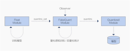 以常用的 Type3 为例,一个完整的量化流程分为三阶段:(1)以一个训练完毕的浮点模型(称为 Float 模型)为起点;(2)包含假量化算子的用浮点操作来模拟量化过程的新模型(Quantized-Float 模型或 QFloat 模型);(3)可以直接在终端设备上运行的模型(Quantized 模型,简称 Q 模型)。