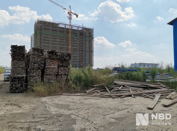 在网安大道南端,则有两栋约10层高的楼房,不过楼房只建成了建筑外壳,并没有门窗等,楼房旁荒草丛生,还有大量板材、管道和电梯随意堆放,部分建材已经生出斑点。