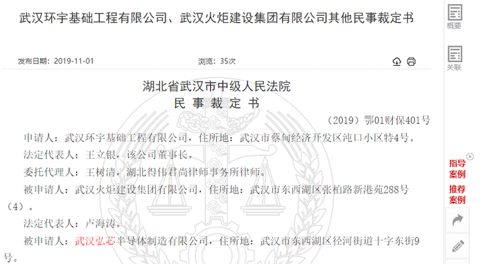 武汉弘芯半导体项目还为此诉讼缠身。湖北省武汉市中级人民法院民事裁定书显示,分包商武汉环宇基础工程有限公司(以下简称武汉环宇)因为4100万元工程款将总承包商火炬集团和项目公司武汉弘芯告上了法庭,并申请账户冻结和查封其他财产。