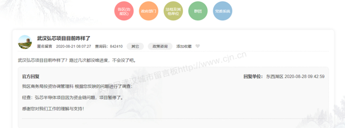 不仅如此,对于武汉弘芯半导体项目的进展,近期也有市民在武汉城市留言板咨询。对此,8月28日,武汉市东西湖区官方回复称,经区商务局投资协调管理调查,武汉弘芯半导体项目因为资金链问题,项目暂停了。