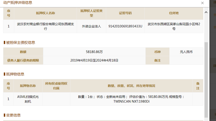 武汉弘芯曾经引以为傲的光刻机也被抵押。启信宝显示,武汉弘芯进行了一笔动产抵押,登记日期是今年1月份。抵押物是1台ASML扫描式光刻机,状态为全新尚未启用,评估价值为58180.86万元。相关的借贷合同数额为58180.86万元,债务履行期限为2019年4月19日至2024年4月18日。