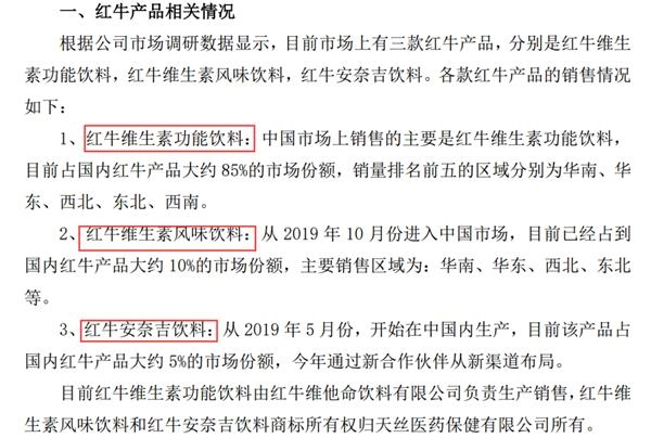 养元饮品在公告中介绍道,目前市场上有三款红牛产品,分别是红牛维生素功能饮料,红牛维生素风味饮料,红牛安奈吉饮料。