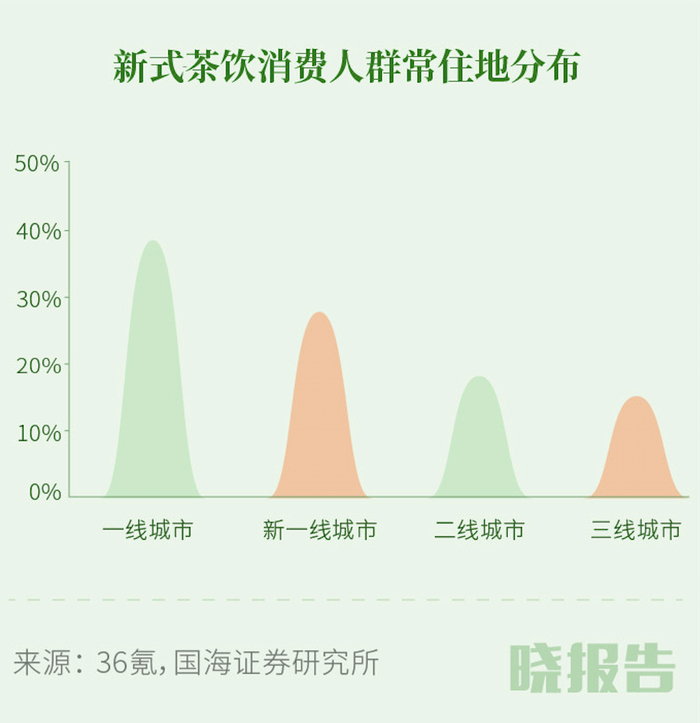 当前,新茶饮门店大多开在东部沿海城市和内陆发达城市。其中,一线和新一线城市新茶饮消费人群分别占39%和28%,二、三线城市消费者合计仅占33%。