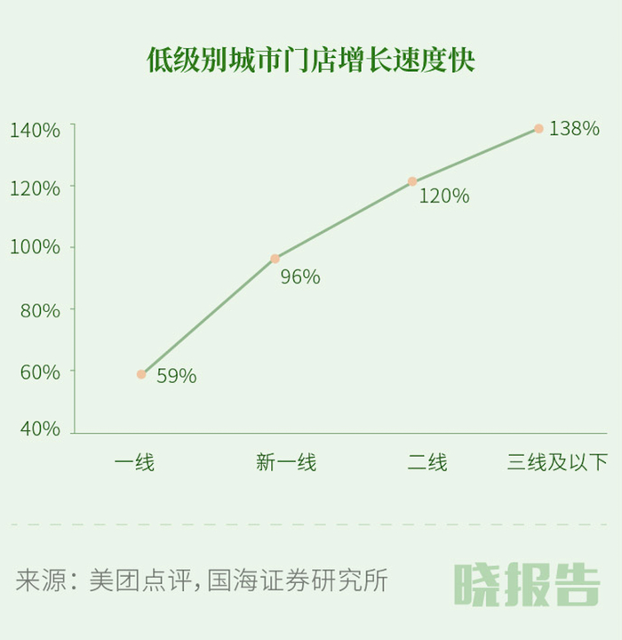 虽然从消费能力来看,下沉市场的平均消费能力不如一线和新一线,但品牌如果在该类型城市中快速跑马圈地,就能形成高密度以及规模效应。