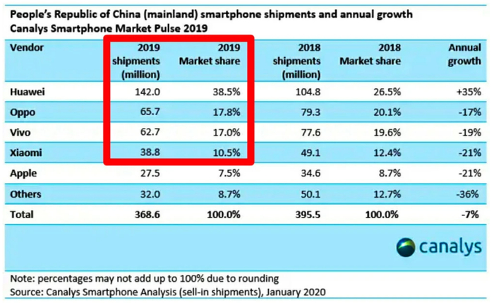 根据市场研究机构Canalys公布数据显示:2019年国内手机市场销量,华为以38.5%的市场份额排名国内第一,同比增长35%;接着排名第二、第三是oppo和vivo;接下来排名第四才是小米,小米国内市场份额只有10.5%,而且同比下滑21%。