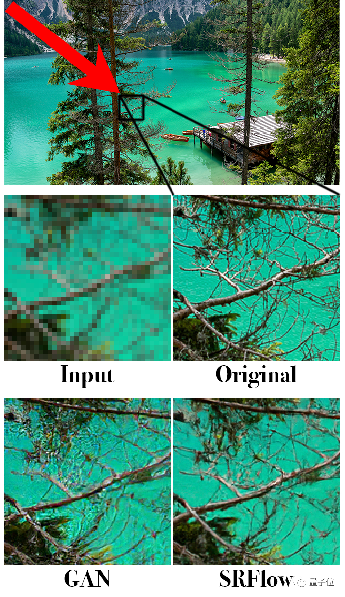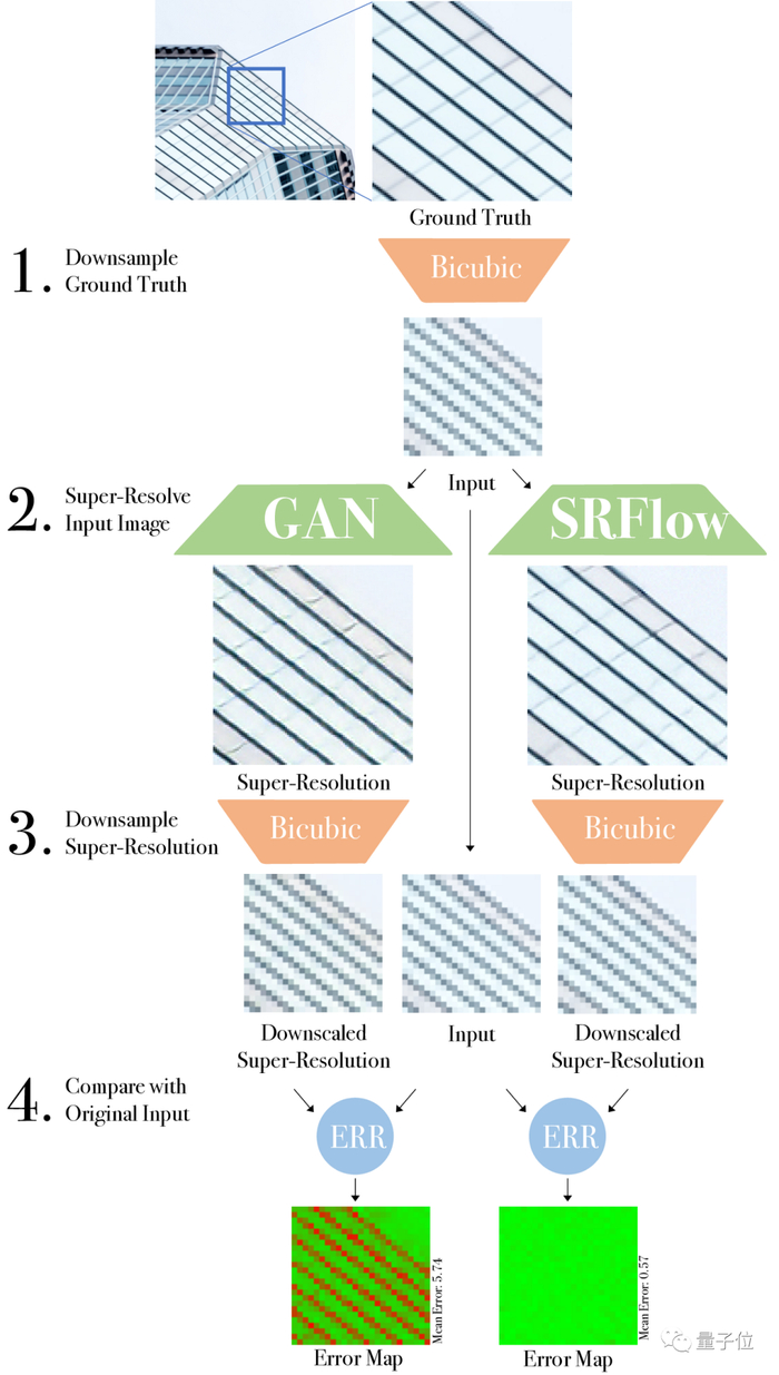将SRFlow的输出与输入对比,可以看出与GAN的结果不同,具有高度一致性。