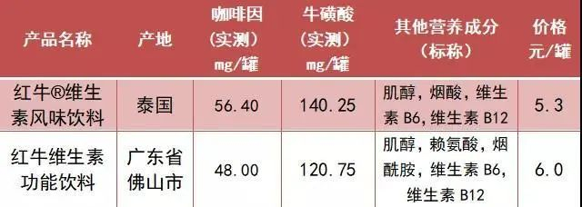检测结果显示:泰国红牛比国产红牛的的咖啡因高17.5%、牛磺酸高16.1%,国产红牛的标称营养素种类更多。