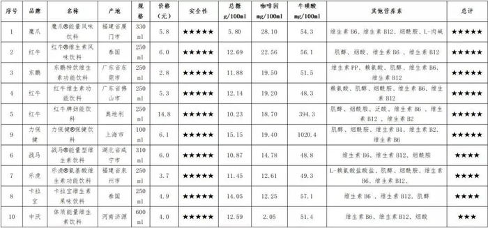 10款样品测试结果普遍偏好,其中国产红牛、泰国红牛、奥地利进口红牛、东鹏、魔爪、力保健6款样品测试结果为五星,乐虎、战马、卡拉宝3款样品测试结果为四星,中沃体质能量样品测试结果为三星。