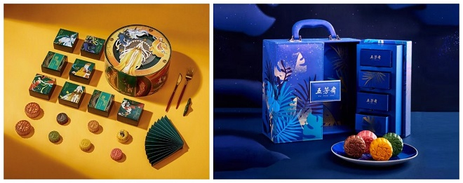 左:《剑网3》X稻香村“梦回稻香”月饼礼盒;右:五芳斋“五芳梦月”糯月饼礼盒|图片来源:网络