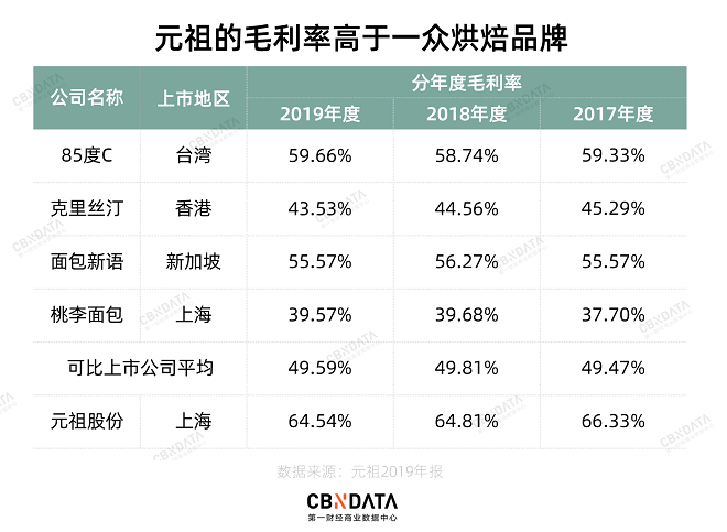 但无论是节庆礼盒还是蛋糕烘焙,元祖在做的都是高毛利的好生意。2019年,元祖月饼礼盒的毛利高达65.85%。在整个烘焙市场,元祖的毛利也远高出85度C、桃李等一众竞争对手。