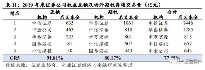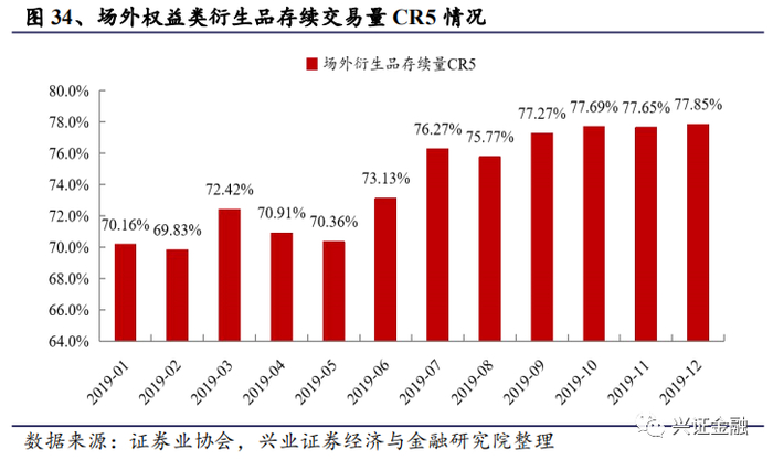 权益类:资质门槛利好头部券商,2019年场外衍生品存续交易量CR5达78%。与海外经验相符,我国场外衍生品市场头部化趋势明显,2019年起场外权益类衍生品存续交易量前5大券商排名中,中信、华泰、建投、申万稳居前4,且CR5从年初70%上升至78%。从收益互换及场外期权细分情况来看,截至2019年末,收益互换存续交易量CR5达到92%,场外期权CR5为80%,均呈现高度集中的格局。除了业务本身的重资产属性和规模经济性驱动头部格局的形成外,我国场外衍生品业务相关资质门槛同样利好头部券商。从场外期权来看,当前证券行业中仅有7家一级交易商及27家二级交易商,未获得资质的中小券商退出该业务领域,而二级交易商开展场外个股期权业务只能进行“背靠背”操作,成本增加,场外期权业务进一步向一级交易商集中。