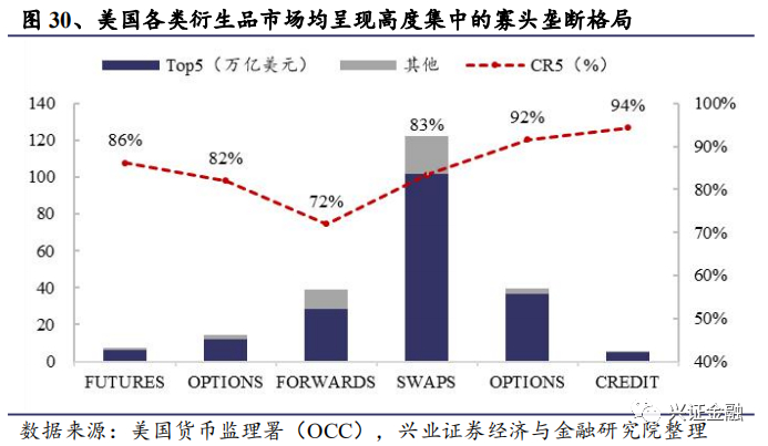美国衍生品市场呈现高度集中的寡头垄断格局。从2019年美国衍生品中介机构市场份额来看,Top5银行控股公司(摩根大通、高盛、花旗、摩根士丹利和美国银行)合计市场份额达83.1%,在场内期货、期权以及场外远期、互换、场外期权等衍生品方面,均呈现高度集中的市场格局,其中场外期权、信用衍生品的CR5高达91.6%、94.3%。一方面由于衍生品做市交易业务的重资产属性和规模经济性,该业务开展首先依托于资产规模的扩张,随着业务规模的扩大,风险对冲的规模经济性显现,利润率逐步提升;另一方面衍生品业务对投行的风险控制和询价定价能力要求极高,大型投行的衍生品投资交易和产品创设经验丰富,业务开展优势远超中小型投行。