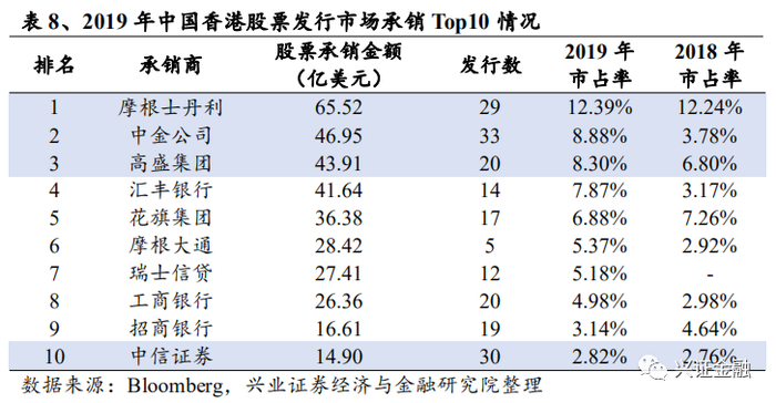 股权承销:券商资产定价能力强,在股权承销领域优势显著。当前国内商业银行主要通过境外子公司平台开展境外股权承销业务,在混业模式的中国香港股票发行市场,银行系券商并未能改变头部券商的核心主导地位,我们认为是由于股票IPO需要较强的发行定价能力,券商相较银行的资产评估、估值定价专业性更强。2019年中国香港股票发行承销市场Top10机构中,前3名摩根士丹利、中金公司和高盛集团市占率分别为12.4%、8.9%和8.3%,其中中金公司为中资券商,摩根士丹利和高盛为外资以券商为主导的金融集团;而外资银行系投行和中资银行系投行位列其后,可见券商在股权承销领域竞争优势显著。