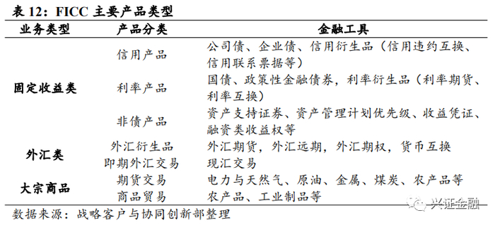 FICC类:以固收为主,外汇及大宗商品等衍生品创设及做市滞后。我国FICC业务已形成以银行间市场为主,交易所市场和券商柜台市场为辅的多层次市场体系。从产品种类来看,随着近年来券商FICC业务深度的不断拓展,业务模式逐渐丰富,信用产品、利率产品、资产支持证券、外汇产品、大宗商品五大条线基本齐全。但国内证券公司的FICC业务主要还是以固收类为主,围绕外汇、大宗商品等衍生品的创设和做市相比国外投行发展相对滞后。