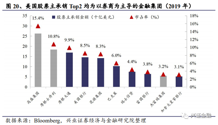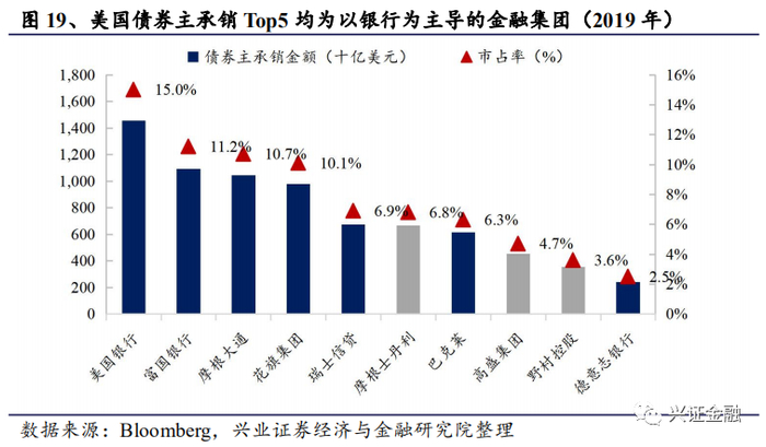 国际经验同样表明:券商股权承销优势突出,而银行债券承销话语权更大。从美国混业经营的实际情况来看,其混业模式主要分为以银行为主导和以券商为主导的金融集团,两者分别在债券和股权承销业务中具有相对竞争优势。从美国2019年股债承销市场来看,债券承销市场前5名均为以银行为主导的金融集团——美国银行、富国银行、摩根大通、花旗和瑞士信贷,合计市占率达52.9%;而在股权承销市场上前2名均为以券商为主导的金融集团——高盛、摩根士丹利,市场份额分别是15.4%、10.8%。混业经营稳态下呈现出银行系金融集团、券商系金融集团、独立券商、独立银行等各类金融机构主体共存的差异化竞争格局。
