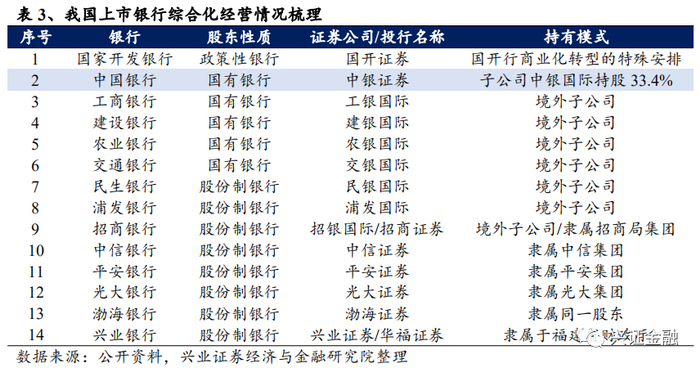 鉴于分业经营体制,目前我国上市银行中仅中国银行和国开行旗下拥有内地券商牌照。中国银行通过子公司中银国际控股持有中银证券33.4%的股权,是国内唯一一家商业银行参股的上市券商;而国开证券虽由国开行全资控股,但只是针对国开行商业化转型的特殊安排,并非真正意义上的“混业经营”。受制于分业经营体制,国内银行选择绕道积极探索综合化经营,通过直接或间接的方式触及证券业务。具体来看,5大国有银行及大型股份制银行选择在中国香港建立子公司的方式从事境外证券业务,如工银国际、农银国际等;另有部分银行通过与同一集团的兄弟证券公司发生业务协同,在同一股东的推动下,银行与券商业务开展产生一定的紧密度。例如中信银行与中信证券、平安银行与平安证券等。此外还有5家券商为境外银行控股,分别为瑞信方正证券、瑞银证券、汇丰前海证券、东亚前海证券和中德证券。