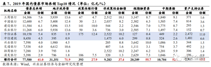 债券承销:商业银行占据银行间债券承销市场的主导地位。商业银行当前可承销的债券品种主要包括地方政府债、政策性银行债、短融、中票等银行间债券品种,而缺乏交易所市场的债券承销资格(公司债和企业债等)和股票承销保荐资格。从2019年债券市场承销排名来看,证券公司仅中信证券和中信建投两家跻身Top10,其余均为商业银行,市场份额合计高达41%。从细分品种来看,商业银行在地方政府债、短融和中票承销上具有显著优势,Top10承销商中银行合计市占率分别为71.9%、55.7%和52.7%,而券商在创新债券品种ABS承销上占据主导。