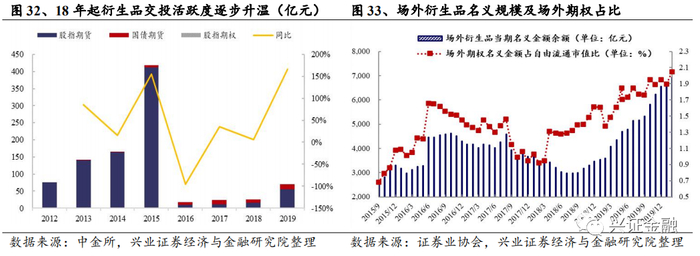 我国衍生品市场发展:2018年起场内交易松绑产品扩容,交投活跃度持续升温。目前我国场内金融衍生品共有9个品种,权益类6种,利率类3种。从成交金额来看,期货类产品占主导;从品种上看,权益类衍生品占主导。由于我国金融衍生品市场起步较晚,且2015年股市异动后股指期货全面收紧,直至2018年股指期货交易条件松绑、场内股指期权种类扩容,衍生品市场交投活跃度才逐渐升温,2019年中金所市场整体成交量达6,641万手/+144%,成交额达69.6万亿元/+167%;其中股指期货成交额达54.8万亿元,同比大增248%。