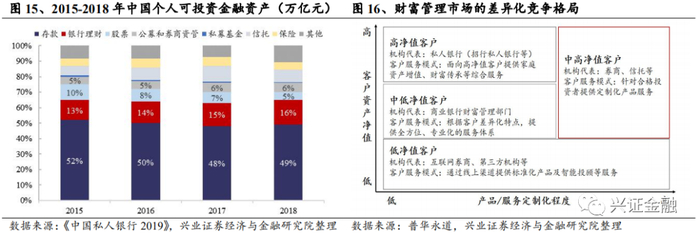财富管理:居民金融资产配置需求快速增长,市场正形成差异化竞争格局。2013-2019年我国个人可投资金融资产从77亿元上涨至166万亿元,CAGR达13.6%,个人可投资金融资产的高速增长为财富管理市场奠定了良好发展基础。针对不同客户分层特征,银行、券商、基金、信托及第三方财富管理机构已经展开了差异化竞争,其中:1)低净值客户:由互联网券商、第三方机构等通过线上渠道提供标准化产品与服务;2)中低/高净值客户:由商业银行财富管理部门提供全方位、专业化服务;以及由券商、信托等机构提供定制化产品及服务;3)高净值客户:由私人银行提供一站式综合金融服务,如招行/工行私人银行等。