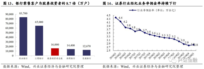传统经纪业务:银行在零售客户的获客和活客方面显著占优,交易佣金面临降维打击。首先从获客来看,2019年末银行业拥有13.95亿个人客户,22.8万个营业网点,分别为证券行业的8.7倍和10.4倍。而截至2019年,我国股票投资者总数为1.6亿,仅相当于工商银行(零售客户6.5亿)的1/4。且银行增加新客户的边际成本趋近于零,拓客积极性高;其次从活客来看,银行能为客户提供更丰富的综合金融服务,包括存款、支付、理财、信用卡和贷款等多重业务,在获取大量客户的基础上,通过交叉销售向其提供更多高附加值、个性化的服务,活跃客户投资交易进行创收。