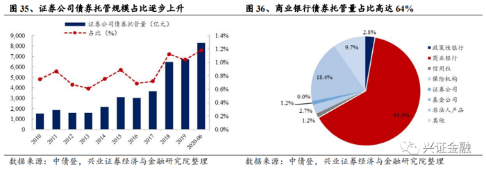 1)固定收益业务:受业务资质限制,银行占据主导地位:截至2020年6月,有30家机构具有银行间债券市场做市资格,其中券商仅有5家,分别为中信证券、中金公司、国泰君安、广发证券和第一创业。从业务规模来看,商业银行占据绝对主导地位。根据中债登债券托管数据,截至2020年6月债券托管量达70万亿元,其中商业银行托管量45万亿元,占比高达64%;其次是政策性银行占比2.8%,而券商仅占比1.2%,但从2018年起证券公司的债券托管量明显增长,系统重要性逐步攀升。