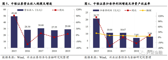 中银证券为中国银行间接持股券商,盈利能力优于行业。中银证券成立于2002年2月,注册资本为25亿元,于2020年2月正式登陆上交所。公司股权结构是“银行—境外控股平台—证券公司”的模式,第一大股东中银国际控股持股33.42%,为中国银行的全资子公司,依托强大的股东背景、渠道资源、客户资源,中银证券业务模式与银行模式深度互补。2019年公司实现营收/归母净利润29.08亿元、7.98亿元,分别位列行业第31/33名;盈利能力优于行业,ROE连续6年跑赢行业平均,2019年ROE水平为6.44%(行业平均为6.09%,位列第29名)。截至2019年末,公司净资产为127.38亿元,位列行业第39名。