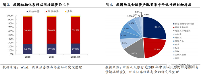 1)增加资本市场供给,提升直接融资比例。当前我国融资体系以间接融资为主导,截至2020年5月社融存量中直接融资占比仅27.8%,与欧美发达国家直接融资超50%相比,仍有较大提升空间。随着我国经济结构转型、新旧动能转换,以间接融资为主的融资结构难以满足新经济企业的融资需求,直接融资市场亟待开拓。由于分业经营使得大量融资客户资源与银行绑定更深,因此向银行开放证券业大门有望实现客户导流,引导客户从间接融资转向直接融资市场,从而有效提升直接融资市场总量,增加资本市场供给。