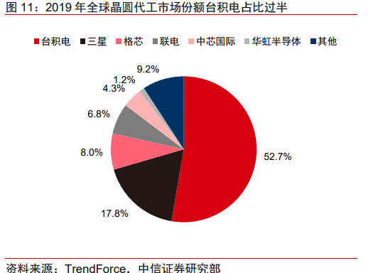 据中信证券,全球晶圆代工业头部集中效应明显。第一梯队为台积电(53%)和三星(18%),基本垄断了先进工艺节点,并领先行业 2-3 代(先进制程 Top2 100%份额,其中台积电 80%)。
