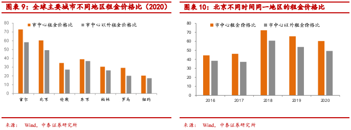分母端,城市人口的增长速度是决定住宅价格的重要因素,资本化率既会在同一时间随位置的不同而不同,又会在同一位置随时间变化而变化。如若一个城市从总体上不会再有增长预期时,其资本化率就是利率,而且在城市的任何地方都相同;如若城市的空间存在增长(比如是由于人口增长而形成的),资本化率会小于利率,而且在城市的不同位置会有所不同。从下图的数据我们也可以看到,由于市中心可能带来更多的收益机会、增长的空间使得房价与租金的比值远高于郊区。
