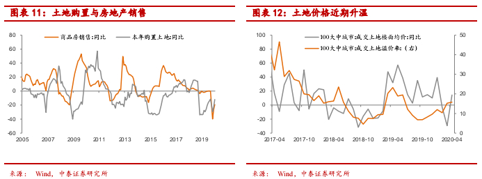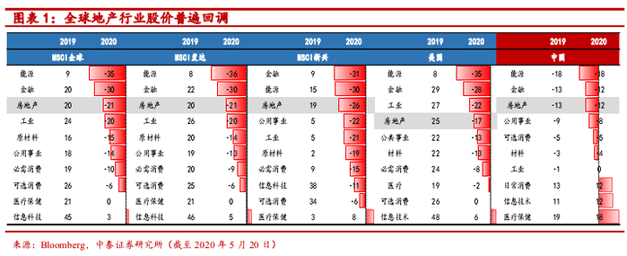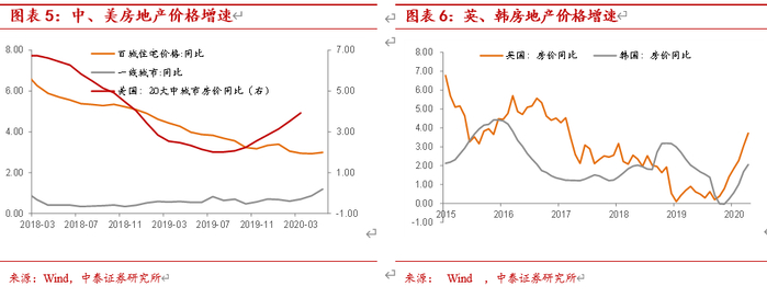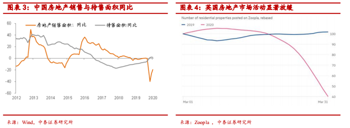 与实体层面销售端走弱相对应的是,房价的坚挺甚至回升。其中,(1)中国市场:1~5月百城住宅价格同比从前值2.93%小幅上升至2.99%,一线城市地产价格则从2019年底的0.71%小幅上升至1.19%;(2)美国市场:标准普尔/CS房价指数20个大中城市的同比增速则从去年底的2.85%持续上升至1季末的3.92%;10个大中城市同比从去年底的2.37%持续上升至3.38%;(3)英国市场:平均房价同比从2019年12月的1.41%持续上升至4月的3.72%。