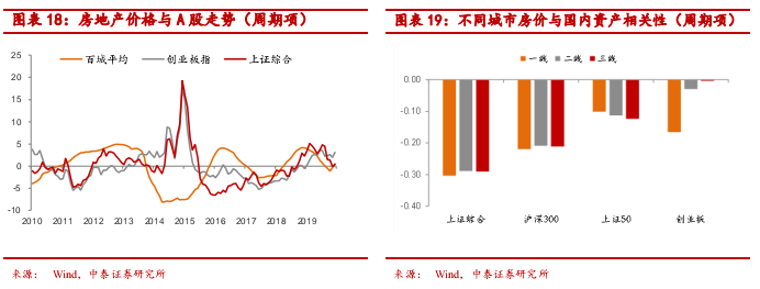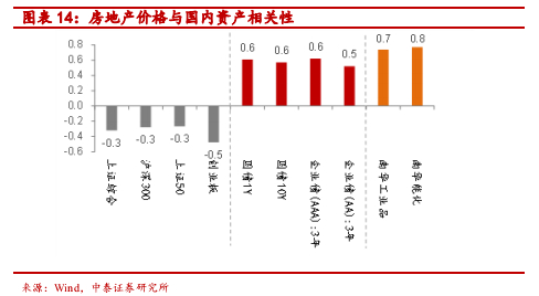 从市场表现看:房价下跌周期中,债券>股票>工业品,房价上升周期中,工业品>债券>股票。在历次房价下跌中,利率普遍下跌,工业品普遍收跌。相反,在房价持续上涨期间,工业品表现亮眼,股票市场整体相对低迷。值得关注的是2015年之后一线城市房价与利率的负相关性愈发明显。