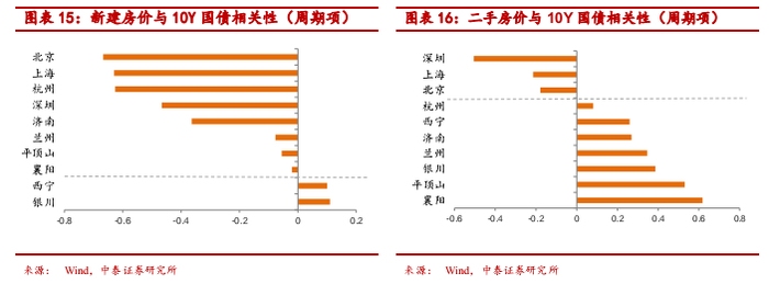 无论是新建房价还是二手房价都北京、上海、深圳等一线城市房价均与利率存在较显著的负相关。考虑到在一线城市成交的房源中,除了新房外,二手房的交易也十分活跃,那么这种由于房源差异是否会导致不同资产的相关性发生改变呢?我们把房价拆分为新建房价与二手房房价,根据我们的估算,在我们筛选的这些城市样本中,新房呈现出更多的投资属性,而二手房体现出更多的商品属性。进一步我们发现,不论二手房还是一手房,北京、上海、深圳的房价均与利率呈现明显的负相关,说明一线城市房产的投资属性更加明显。