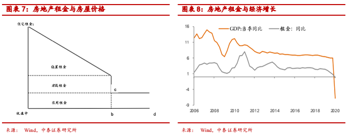 分子端,区位与经济增长是影响租金高低的重要因素,而新增住房的建设成本决定了城市边缘的最低租金。借鉴DiPasquale &Wheaton(1996)的分析框架(1)从微观层面看,我们将城市的住宅租金拆分为三类:分别是将农用土地转为城市用地所必须的农业用地租金、坐落在土地上的建筑物租金以及交通费用节省带来的区位租金。通常情况下,农业用地租金以及建筑租金在不同的位置都较为稳定,而随着向远离市中心的方向移动,租金将随着交通费用的增加而逐渐降低,直至到城市边缘,租金降至最低点。(2)从宏观层面看,长期来说物业市场的租金的变化与经济增长正相关的。