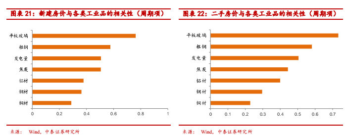 虽然二手房价与各类工业品的相关性要弱于新建商品房,但是需求周期的纽带作用稳定存在。进一步计算了房地产价格与各类工业品产量同比增速的相关性,数据显示,房价与工业品产量变化普遍正相关,其中,平板玻璃与房价增速的相关性最高,相反,铜材、铝材与房价的相关性较弱。