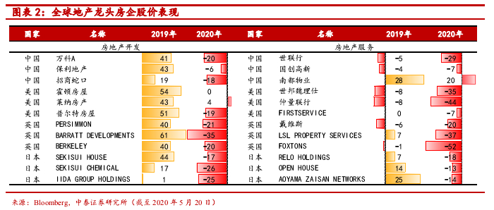 即使是存量博弈下的佼佼者,全球地产龙头股也未能幸免,出现了不同程度的下跌。考虑到国外房地产上市公司包含大量的房地产投资信托(REITs)公司,与A股差异明显,整体可比性较差。因此,本文重点关注的是以房地产开发与经营为主业的上市公司,并将该行业市值前三名定义为行业龙头。数据显示,与2019年股价普遍上涨不同的是,今年无论是以房地产开发还是以房地产服务为主业的龙头公司,股价都出现不同程度下跌。