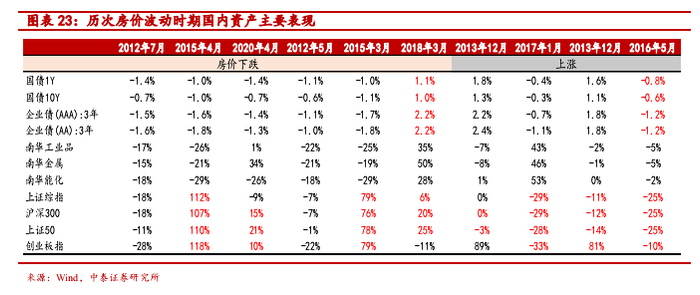 我们重点回顾了2011年以来房地产,尤其是一线城市房地产房价历次下跌、上涨周期中国内资产的表现: