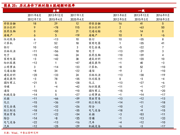 具体到行业来看,我们进一步整理了历史上房价下滑期间各行业的相对收益,数据显示,无论从不同百城样本还是一线城市数据看,食品饮料、非银金融等行业往往有不错的表现,相反,汽车、商业贸易等可选消费行业整体表现低迷。