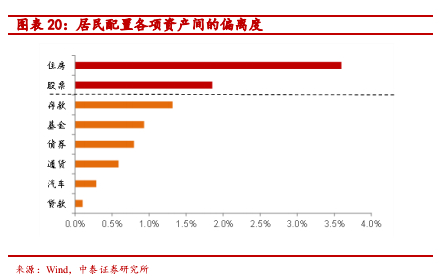房价与股票:房价与国内股票指数普遍负相关,相关性要弱于利率。从资产配置的角度看,房地产销售放缓,价格回落时,增量资金可能会涌向股票等其他类别资产。从历史表现来看,2014~2015年国内市场出现了明显的资金从地产流出流入股市,然后又从股市流出流回地产的过程。值得关注的是2017年之后,一线城市房价与股票资产的相关性整体来看更高。通过进一步计算居民配置的各项资产配置比例相较趋势值的偏离变化,我们发现股票、地产的偏离度远高于其他类型资产,说明股票、房地产是居民短期资产配置调整的主要领域。