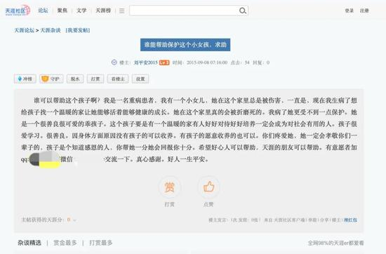 回到2015年,也有证据显示,刘平安确实是要送养女儿。2015年9月6日,她注册了天涯账号“刘平安2015”。两天后,她在论坛发帖《谁能帮助保护这个小女孩,求助》。