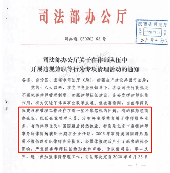 今年6月,司法部文件点名鲍毓明。其在2006年取得美国国籍后隐瞒不报,仍以专职律师身份执业,属违法违规行为。