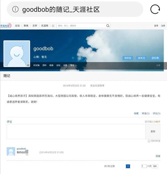 他的收养过程比刘平安早。2014年4月,鲍毓明注册了天涯账号“goodbob”。他发帖说: