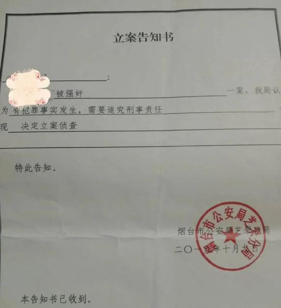 一个月后,去年10月9日,烟台市芝罘区公安局再次立案。立案告知书显示,针对李星星“被强奸一案,我局认为,有犯罪事实发生,需要追究刑事责任”。这是对此案比较初步的官方定性。