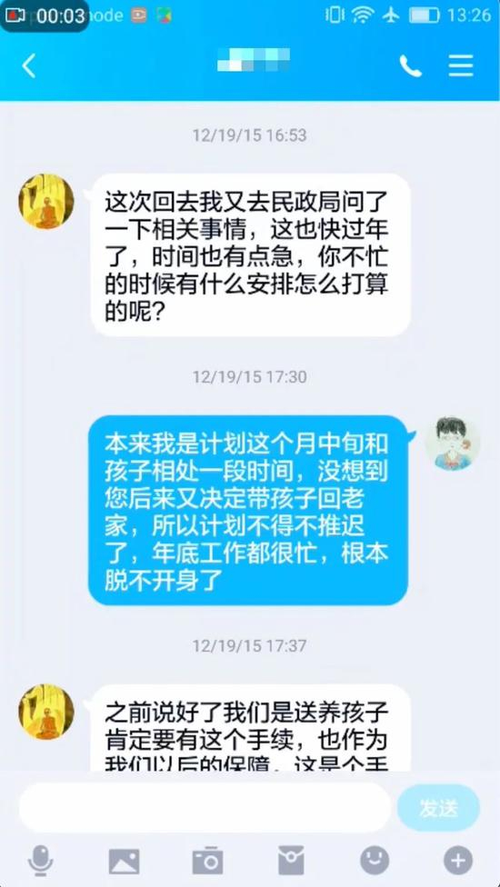 相关的疑点,体现在鲍毓明方面提供的聊天记录。2015年12月19日,刘平安对鲍毓明说:“这次回去(老家),我又去民政局问了一下相关事情,这也快过年了,时间也有点急,你不忙的时候,有什么安排,怎么打算的呢?”——刘平安仍在了解收养手续。