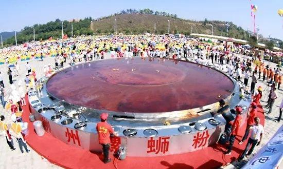 同年10月,作为柳州市美食联盟协会的会长,倪铫阳和协会配合柳州市委市政府在柳州会展中心搭建了一口直径21米的大锅,煮上螺蛳粉,组织了一场有1万多人参加的“万人同品螺蛳粉”活动,轰动一时。“里面一共有12吨汤、1000斤螺蛳、2000个鸭脚、1000个猪脚、1000个卤蛋,还有300只鸡。”说起八年前的那场活动,倪铫阳还记忆犹新,这场活动趁着《舌尖1》的余热,把螺蛳粉的知名度又推上了一个小高峰。